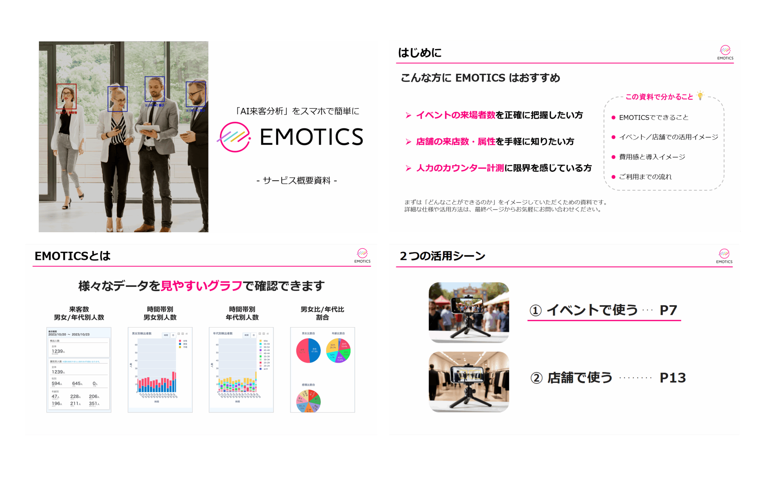 EMOTICSの機能紹介や料金プラン、活用事例、ダッシュボードのサンプル画面などを紹介します。社内共有用にご活用ください。